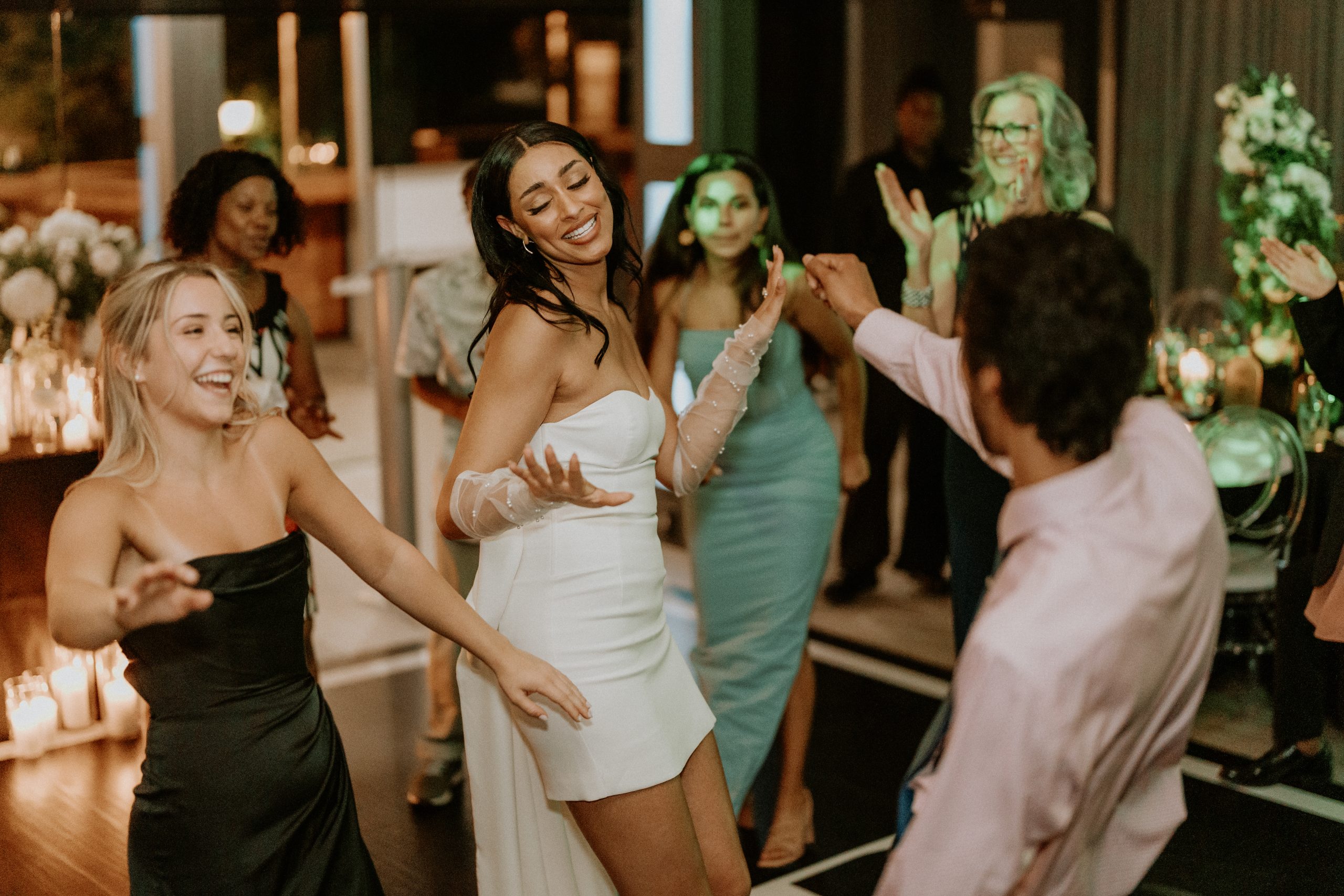 When guests moved indoors, they were welcomed into the grand ballroom — a space that transitions seamlessly from ceremony to celebration. With capacity for over 240 guests, the ballroom offers a vibrant atmosphere with customizable LED lighting, a central bar, and ample room for dinner and dancing. The space can be transformed from soft romantic tones to lively party energy in seconds — a photographer’s dream for capturing every mood. For Tianna and Thomas, this transformation made their night feel like two distinct celebrations — one intimate, one unforgettable.